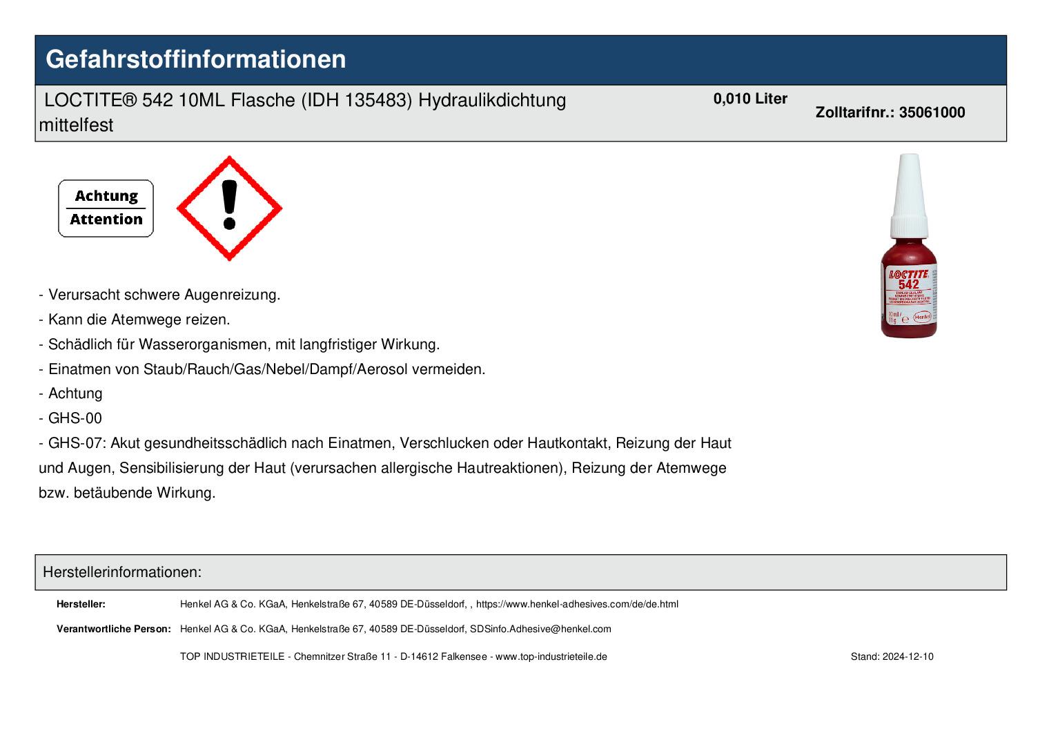 Gewindedichtung LOCTITE 542 ist eine flüssige Gewindedichtung, die ideal ist für Feingewindeverbindungen an Hydraulik- und Pneumatikanlagen sowie generell für Verschraubungen. Sie ist geeignet für Metall, besonders Hydraulikrohre und ist DVGW zertifiziert.