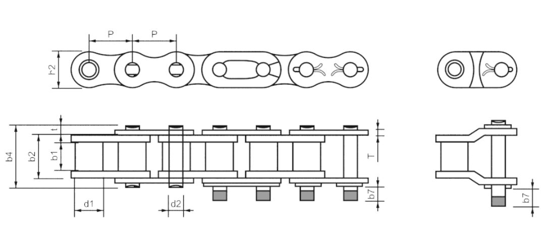 Eine Simplex Rollenkette besteht aus einer einzigen Reihe von Rollen und Laschen.