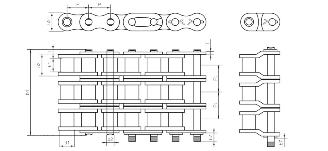 Eine triplex Rollenkette besteht aus Drei Reihen von Rollen und Laschen.