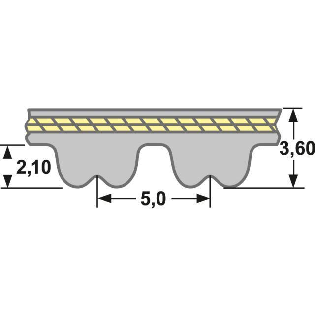 gesamte Zahnhöhe und ermöglicht gegenüber anderen Synchronriemen, ein noch ruhigeres einlaufen in die Zahnscheibe. Der Körper besteht aus einer innovativen Gummimischung die mit einer speziellen Faser verstärkt ist. Kontinuierlich spiralförmig gewickelte Glasfaserkorde bilden das Zugelement des Riemens. Ein verschleißfestes Nylongewebe mit Selbstschmierfähigkeit bedeckt die Zahnoberfläche.